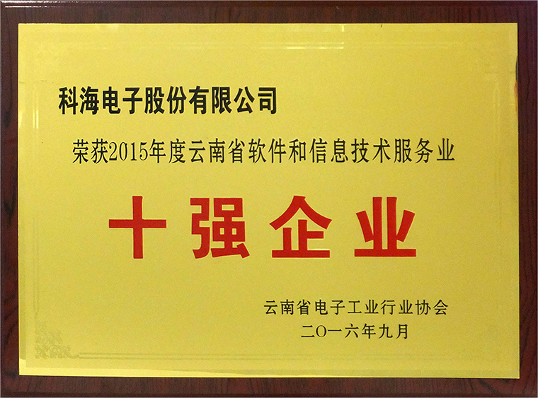 九月,一個收獲的季節(jié),公司榮獲了云南省電子工業(yè)行業(yè)協(xié)會頒發(fā)的“2015年度云南省軟件和信息技術(shù)服務(wù)業(yè)十強(qiáng)企業(yè)”的榮譽(yù)稱號。